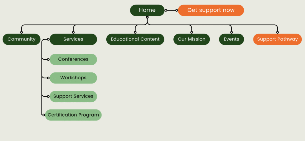 To clarify how users would navigate this first version of the solution, we created a simplified sitemap that organizes the experience around clear, purpose-driven pathways. Each section reflects a specific user intention, helping entrepreneurs quickly understand where to go depending on the type of support or information they need. This sitemap also served as the foundation for our user flows and early wireframes, ensuring consistency across the entire experience.