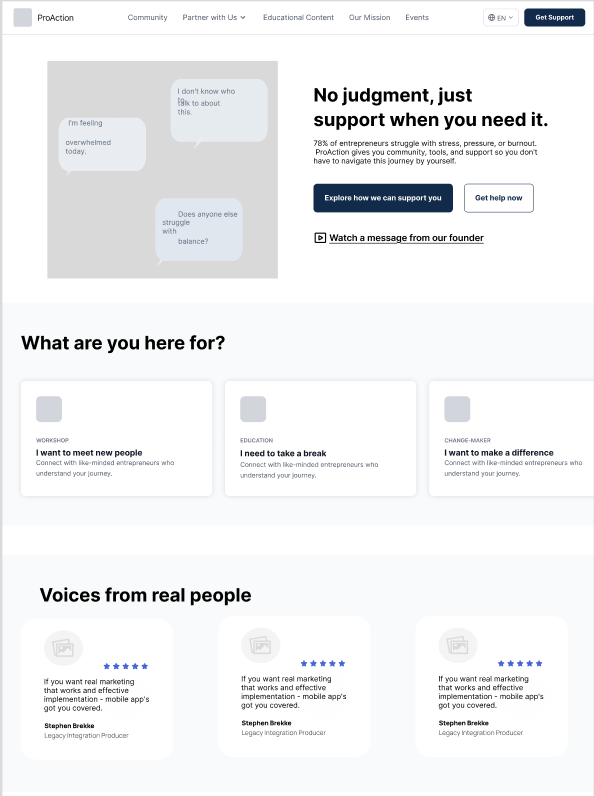 Design a simple, trustworthy, easy-to-navigate experience that gives entrepreneurs immediate access to support while clearly explaining ProAction's value. To achieve this, we focused on three outcomes: